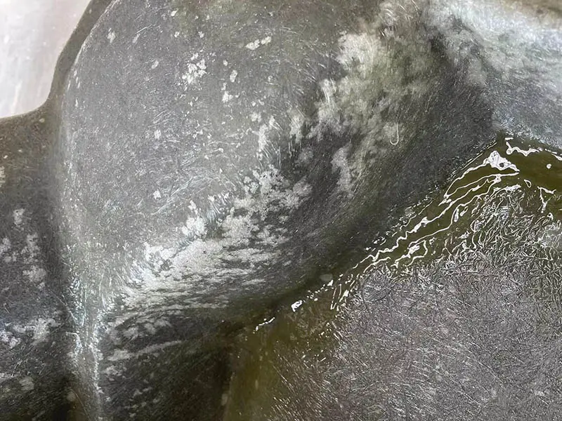 客户反馈说聚酯树脂在立面上挂不住,都流淌了,这玻璃钢缺胶怎么处理?从图片中可以看到,部件底部有树脂胶积聚情况,玻璃纤维发白位置缺胶,下面简单说下问题所在及解决办法。1.树脂黏度及触变性能的影响:通常来说,树脂黏度越大,触变性越高,越不容易流挂。在树脂不能更换的情况时,您可加入少量气相二氧化硅增加触变性能以提高抗流挂性能,当然这会额外增加成本。2.玻璃纤维的选择:由于凸棱角位置或立面位置,加上偏硬的乳剂玻璃纤维毡硬挺度较高,不易贴敷在表面,树脂胶很容易由于空隙流挂,您可以把短切毡撕碎或者使用粉剂型短切毡来加固该位置。3.滚压处理:仔细滚压要始终贯穿整个玻璃钢工艺中。切记在确保玻璃纤维充分浸润的前提下,树脂胶越少越好。较多树脂胶是直接加剧树脂流挂的根本原因。总之,玻璃钢经验来自实践,由于工况条件差异,细节上需要您根据自己实际条件随之来做对应解决方法了。