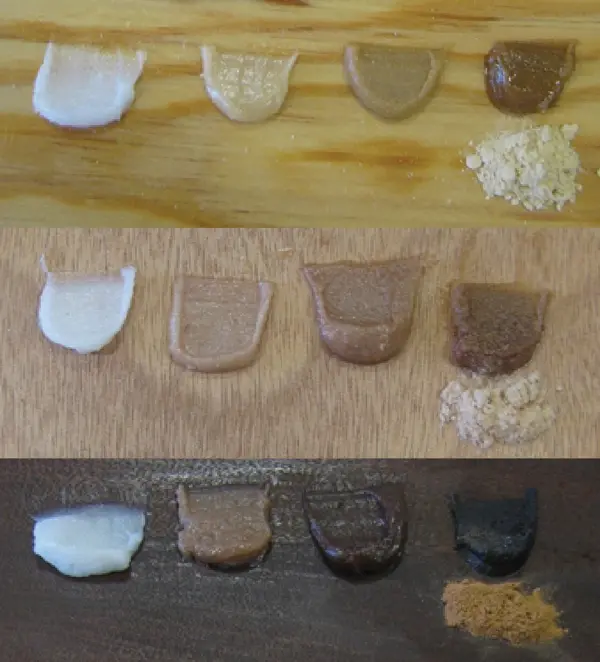 更好的方法是首先用胶体二氧化硅填料将一批环氧树脂增稠至蛋黄酱稠度(这将产生半透明的白色/光滑和乳脂状环氧树脂),然后添加木材打磨灰尘,直到达到您满意的颜色。填料的半透明白色很容易被木材打磨粉尘克服。添加一点木屑,你会得到一种比木头更轻的彩色环氧树脂。在填料增稠环氧树脂混合物中加入大量木材打磨粉尘,它会变黑。查看三种不同木材类型的照片,每种木材都有四块加厚环氧树脂。