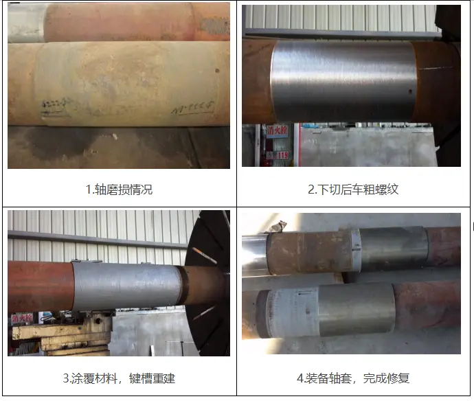 步骤:水泵由国内泵厂生产,轴功率2034KW,流量37620立方/小时立式循环水泵主轴。立式水泵轴轴套部位大部分磨损超过1毫米以上,运行中抖动严重,导致电机能耗增加,同时存在安全隐患。由于磨损面积大,厚度深,无法安全可靠的进行刷镀和堆焊修复。使用金属冷焊材料离线机加工工艺非常简单地解决了问题,无需焊接进而避免了热变形和后期断裂风险,2016年采用该工艺对该电厂水泵轴中的3根进行了修复,为客户节约大量更换新轴的费用支出,修复后的轴至今一直处于稳定运行状态。
