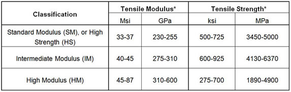 标准模量 (SM) 或高强度 (HS) 碳纤维是海洋、风能和运输等工业应用中使用最广泛且经济的纤维。这种类型的纤维得名于早期的碳纤维,当时随着模量的增加,拉伸强度大大降低。在此期间,标准模量纤维的拉伸强度在 500ksi(3450 MPa)左右达到峰值,而高模量纤维则低得多,约为 275 ksi(1890 MPa)。HS 碳纤维仍然具有所有工业级增强纤维中最高的强度值,以及大约是标准无碱玻璃纤维 3 倍的模量。HS 碳纤维相对较高的断裂伸长率(1.5-2.0% 的理想纤维值)也使它们能够用于高度动态的应用,例如游艇船体、中等模量 (IM) 纤维是为高性能航空航天应用开发的,这些应用需要比标准 HS 碳纤维更高的强度和模量。虽然仍主要用于航空航天,但 IM 碳纤维也被用于高性能压力容器、帆船桅杆和其他性能超过价格的工业应用。高模量 (HM) 纤维通常用于高端体育用品和空间结构,其中高刚度和低至零热膨胀提供最佳重量和性能。通常,随着模量的增加,强度会由于纤维的结晶增加而降低。多年来,在提高 HM 纤维的强度、降低其脆性(理想的纤维断裂伸长率仍为 0.5-1.4% 左右)以及增加其使用方面取得了进展。随着模量的增加,价格也随之增加,使 HM 纤维成为最昂贵和产量最少的 PAN 基碳纤维。IM 和 HM 碳纤维的直径小于 HS 纤维(分别为 5 µm 和 7µm),后者在相同的丝束尺寸下产生更细的产量或 TEX 值。