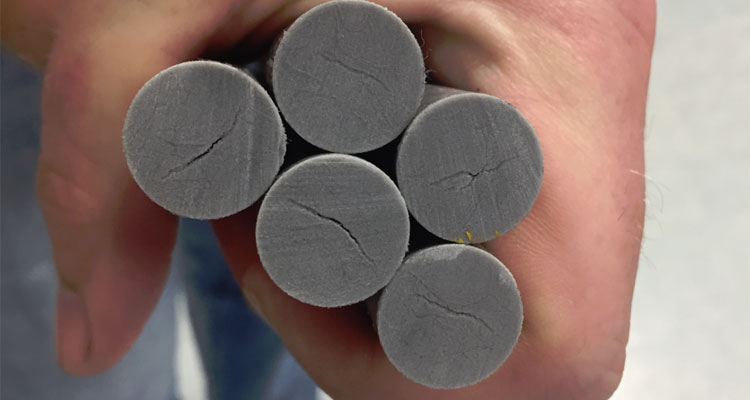 在用于加工薄复合部件的拉挤成型和纤维缠绕应用中,单过氧化物如过氧化苯甲酰(BPO)可能就足够了。在某些情况下,一种快速分解的过氧化物可能不会产生足够的自由基来完成固化。对于中等厚度的零件,可能需要多种过氧化物体系。而且,高度放热的反应经常会导致部件中的不均匀温度分布问题,这可能导致残余应力和开裂,特别是在厚部件中。下图显示了一个部分中心的裂纹示例,这些考虑可能没有得到适当的控制。