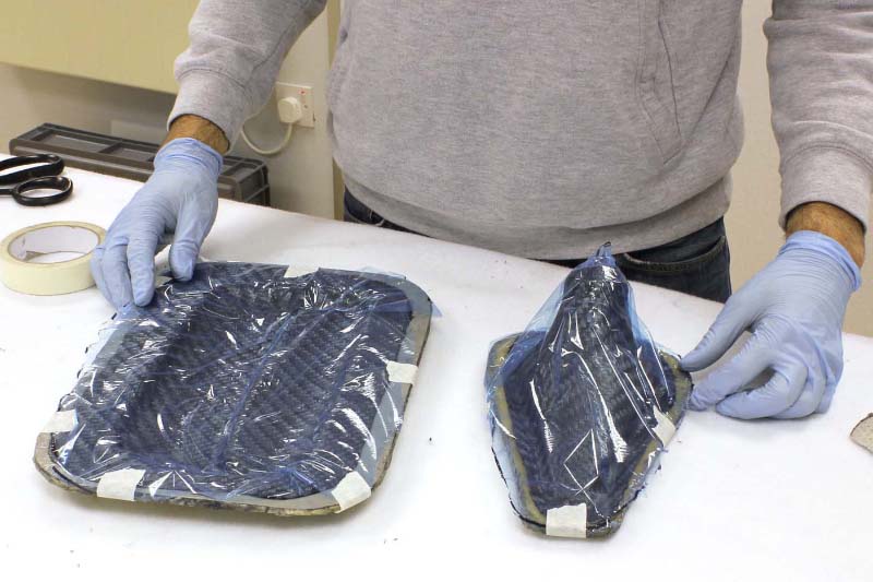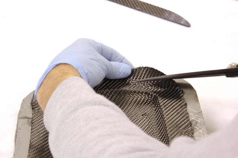 首先,将预浸料保护膜细心的揭掉,树脂膜一面朝下,放入模具中。将预浸料轻轻放平到模具上大的、平整的区域,然后轻轻拉,使材料平滑地覆盖到更多复杂的区域。你可以发现用热风枪或者吹风机可以有效地使预浸料变柔软、易扭曲,更容易铺层。实际上你会惊讶预浸料在这方面是多么的可塑和有弹性,和干织物相比,你只需要一点耐心就可以将预浸料铺到整个模具表面上。