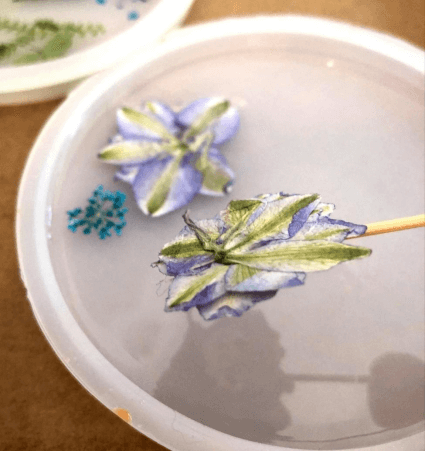 - 如果您的树脂很薄并且花朵没有先粘住,它们可能会不断弹出到表面。用牙签戳它们,直到树脂变稠。(您不必一直按住它们 – 只需在树脂较厚时将它们戳在下面即可。
