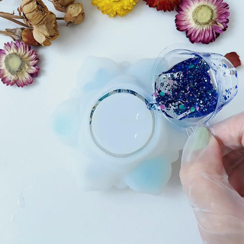 不要忘记在树脂顶部添加一些闪光以完成整个设计。您可以直接从他们的收件人那里倒一些。